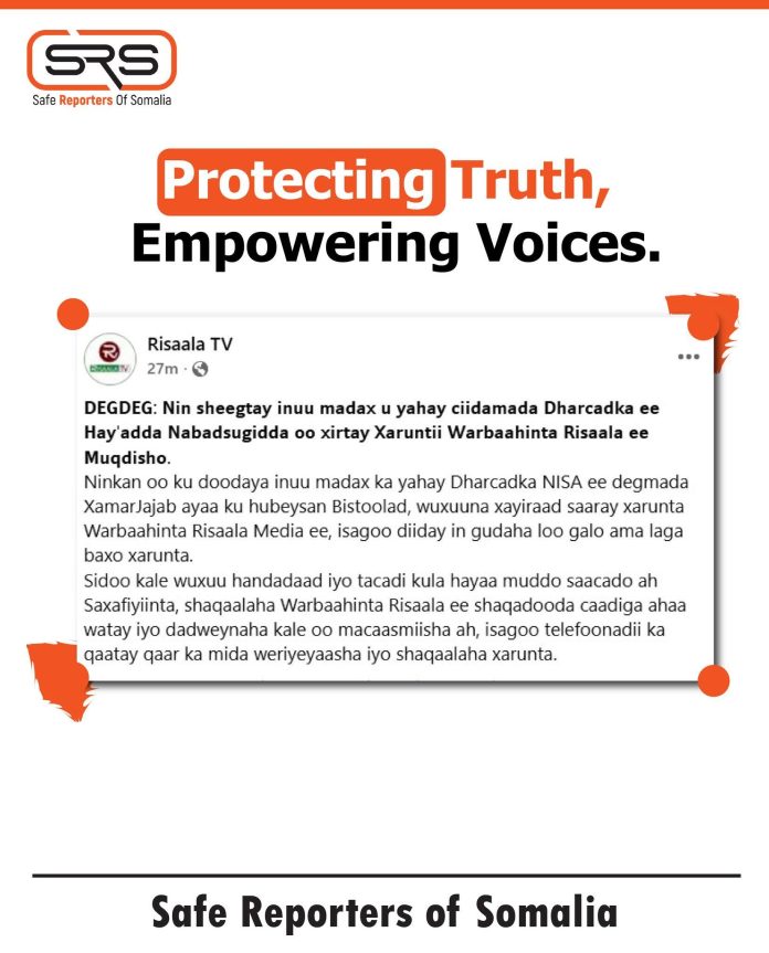 MOGADISHU — Safe Reporters of Somalia (SRS) strongly condemns the disruption of operations at Risaala Media headquarters in Mogadishu on Tuesday, after an armed officer reportedly blocked staff from entering or leaving the premises.